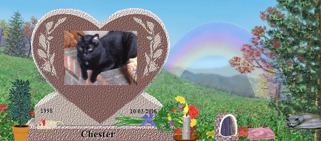 Dear Chester, how purrfectly handsome you are! Please go to the Bridge and purr your precious love down the Rainbow straight into the heart of your mommy who misses you so much, and she will send her love right back to you on angels' wings. Dear Cara, your world has lost a very special furpurrson, family member and friend, and heaven has welcomed Home a very special soul. Chester is now your very own angel, watching over and for you, just as Jackie, Callie, Tashi, Katy and BG are watching over us, until you meet again and cross the Bridge together. May his sweet presence continually nuzzle your heart until then, and may you find comfort in knowing that the silver thread of love that binds you heart to heart with Chester will never be broken. Many blessings and much peace, Clare and Martha...Please visit our Jackie at https://www.rainbowsbridge.com/residents/JACKI010/resident.HTM