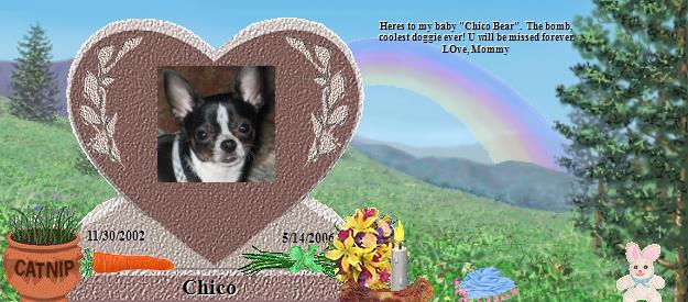 Hullo Chico-how cute you were, and the apple of your moms eyes. Now you are her Guardian Angel, and one more perfect shining star in the Heavens.Smile down from the Bridge and send one of your doggie kisses your moms way--she will know it is you. I stopped because i wanted to wish you a Merry Christmas from my furbaby Caleb and from me. The Bridge is all abuzz with Christmas, and Caleb was out and abot checking all the decorations with some of his friends-Pressy and China, whose parents are special people too. Chico-it sounds like you are going to have plenty of presents to open, so have fun. Caleb told me the presents are all colorfully wrapped with -get this-softly glowing ribbons and bows, and each one has its own individual name card that Caleb says has written-WRAPPED WITH TH LOVE OF YOUR FAMILY-now i couldn't think of of any place i'd rather have my Caleb than this beautiful Meadow. Peace to you and your family.