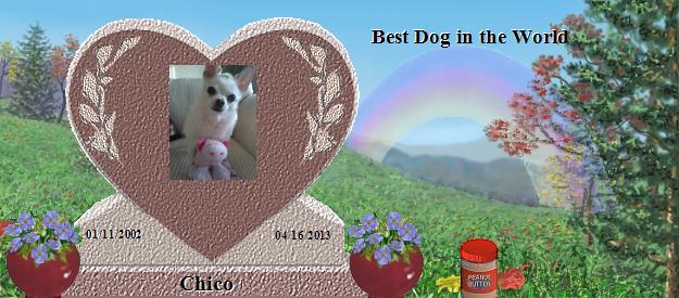 I am so sorry to hear about your loss of Chico. Please find comfort in knowing that Chico is now at Rainbows Bridge and making lots of friends. Saying goodbye is never easy. I also lost my precious cat Spooky July 30th 2001 after 16 wonderful years with her. Just recently on January 11, 2013, I lost my faithful friend Hannah who was a beautiful blue tick hound dog. Spooky never met Hannah but I am sure Spooky greeted Hannah at the bridge. I am sure that Chico, Spooky, and Hannah have become good friends. You can visit with Spooky at: http://www.rainbowsbridge.com/residents/Spook002/resident.HTM Take Care, Susan