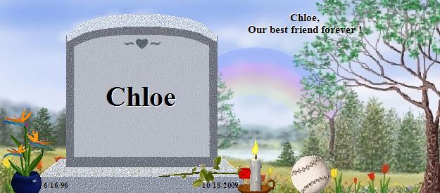 I am so sorry to hear about your loss of Chloe. Please find comfort in knowing that Chloe is now at Rainbows Bridge and making lots of friends. Saying goodbye is never easy. I also lost my precious cat Spooky July 30th 2001 after 16 wonderful years with her. I am sure that Chloe and Spooky have become good friends. You can visit with Spooky at: http://www.rainbowsbridge.com/residents/Spook002/resident.HTM Take Care, Susan