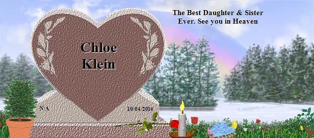 Dear Chloe Klein, you are truly cherished. Please go to the Bridge and purr your precious love down the Rainbow straight into the hearts of your mom, dad and sister who miss you so much, and they will send their love right back to you on angels' wings. Dear Dennis and family, your world has lost a very special furpurrson, family member and friend, and heaven has welcomed Home a very special soul. Chloe is now your very own angel, watching over and for you, just as Tashi, Katy and BG are watching over us, until you meet again and cross the Bridge together. May her sweet love continually nuzzle your hearts until then, and may you find comfort in knowing that the silver thread of love that binds you heart to heart with Chloe will never be broken. Many blessings and much peace, Clare and Martha...Please visit our Tashi at http://www.rainbowsbridge.com/residents/TASHI002/resident.HTM