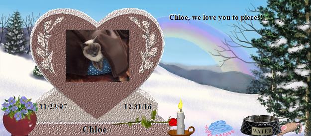 I am so sorry to hear about your loss of Chloe. Please find comfort in knowing that Chloe is now at Rainbows Bridge and making lots of friends. Saying goodbye is never easy. I also lost my precious cat Spooky July 30th 2001 after 16 wonderful years with her. On January 11, 2013, I lost my faithful friend Hannah who was a beautiful blue tick hound dog. On August 2, 2013 another one of my beautiful cats, Sammi, a black and white tabby, went to Rainbows Bridge. April 9, 2014, Maci, my English Bulldog passed over to Rainbows Bridge. Maci and Hannah were best friends. I am sure that Chloe and my babies have all become good friends. You can visit with Spooky at: http://www.rainbowsbridge.com/residents/Spook002/resident.HTM Take Care, Susan