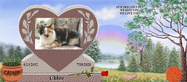 Peggy and John , Chloe may have left her tired, aching body, but she has not left you, she never will, our dear sweet furbabys are with us unto eternity. the love we shared with them, endures, and will always endure, i lost my dearest buddy and closest friend Tiny four years ago. and still i shed a tear, sometimes many whenever i think of him. but the thought he has never left me remains,and that knowledge i cling to. We are far better people for having known, loved, and cared for these dear dear friends, they gave us so much, and yet asked so very little in return, the love they gave us, is love in its purest form. it was unconditional. and eternal. if Chloe could say a few words to you, she would say, thankyou for the wonderful life you gave me, and the wonderful, sweet love we shared. my deepest sympathy, and kindest regards. bless you, and sweet Chloe. Tiny also has a memorial here. what a beautiful thought that Tiny and Chloe will again join us when our time arrives.