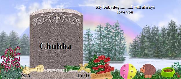 Chubba, What a gorgeous baby you were, always so loyal and loving.You taught and gave your mommy so much that she now knows the true meaning of unconditional love.She longs for the day to be able to hold you and to look into your eyes again.I know just how grateful you are for all of love and care in which she provided you.She misses you baby, so very much. I know that you don't want her to be sad for too long, but instead, be happy. For you are happy, content at peace and have been surrounded by so many others who also love and adore you, including my Shayna Girl and Leche.I extend my deepest condolences to you for the loss of Chubba.I know just how painful it is to have lost your angel, for, I too, lost mine. Please vist my Shayna Girl at: http://rainbowsbridge.com/residents/SHAYN005/Resident.htm. My thoughts and prayers are with you. Until we are with our babies again. Shayna and Leche's mommy, Lisa