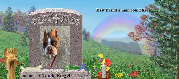 Dear Chuck Biegel, you are truly handsome. Please go to the Bridge and send your precious love down the Rainbow straight into the hearts of your family who miss you so much, and they will send their love right back to you on angels' wings. Dear Nick, your world has lost a very special furperson, family member and friend, and heaven has welcomed Home a very special soul. Chuck is now your very own angel, watching over and for you, just as Jackie, Callie, Tashi, Katy and BG are watching over us, until you meet again and cross the Bridge together. May his sweet presence continually nuzzle your heart until then, and may you find comfort in knowing that the silver thread of love that binds you heart to heart with Chuck will never be broken. Many blessings and much peace, Clare and Martha...Please visit our Jackie at https://www.rainbowsbridge.com/residents/JACKI010/resident.HTM