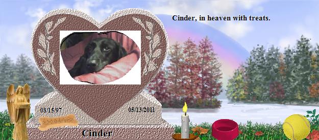 "God gave us our memories so that we might have Roses in December." a quote by J.M. Barrie. May the memories of your blessed furangel Cinder, the ones that can't help but bring a smile to your face and a chuckle to your heart as you remember how your baby’s paw prints touched your life, be the ones that surround you this Holiday Season. My prayer for all of us this Christmas season, is that each of our babies wrap up a special little sign for each one of us back here, and send it to us during this blessed season. May you catch a glimpse of your special sign, just when your heart needs it the most....And may each love-filled memory you have of your beloved fur-angel bring to your heart the very warmth and sunshine of the Rainbow itself. That's just one "gift" your baby-angel would want for you this year...Best wishes for you and your family this Holiday Season, Karen (Dusty, DJ & Patches mom) http://RainbowsBridge.com/residents/DUSTY101/Resident.htm