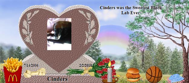 Dear Cinders, you are truly cherished. Please go to the Bridge and send your precious love down the Rainbow straight into the hearts of your mommy and daddy who miss you so much, and they will send their love right back to you on angels' wings. Dear Gary and Brenda, your world has lost a very special furperson, family member and friend, and heaven has welcomed Home a very special soul. Cinders, along with Max, is now your very own angel, watching over and for you, just as Tashi, Katy and BG are watching over us, until you meet again and cross the Bridge together. May their sweet presence continually nuzzle your hearts until then, and may you find comfort in knowing that the silver thread of love that binds you heart to heart with Cinders and Max will never be broken. Many blessings and much peace, Clare and Martha...Please visit our Tashi at http://www.rainbowsbridge.com/residents/TASHI002/resident.HTM