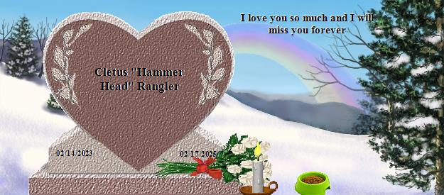 Dear Cletus "Hammer Head" Rangler, you are truly cherished. Please go to the Bridge and send your precious love down the Rainbow straight into the hearts of your family who miss you so much and they will send their love right back to you on angels' wings. Dear Ethel, your world has lost a very special furperson, family member and friend and heaven has welcomed Home a very special soul. Cletus is now your very own angel, watching over and for you, just as Jackie, Callie, Tashi, Katy and BG are watching over us, until you meet again and cross the Bridge together. May his sweet presence continually nuzzle your heart until then, and may you find comfort in knowing that the silver thread of love that binds you heart to heart with Cletus will never be broken. Many blessings and much peace, Clare and Martha...Please visit our Jackie at https://www.rainbowsbridge.com/residents/JACKI010/resident.HTM