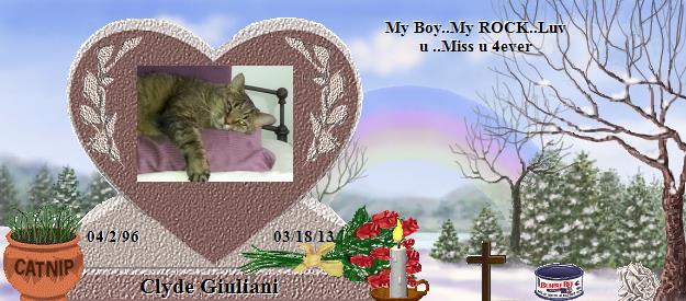 Clyde Giuliani, please find my little Zaki. He has only been there 2 months and I am lost and always will be lost without him with me, too! I hope you two can "head bump, purr', and become great friends and comfort for each other now. I did not have the chance to say good-bye the way your mommy did so I am counting on you little one, to make a new friend out of him. Bless you!