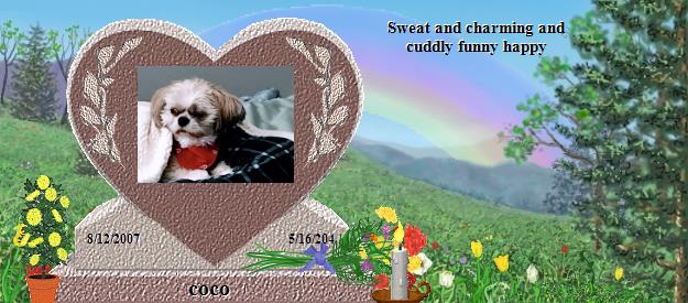 I am so sorry to hear about your loss of Coco. Please find comfort in knowing that Coco is now at Rainbows Bridge and making lots of friends. Saying goodbye is never easy. I also lost my precious cat Spooky July 30th, 2001, after 16 wonderful years with her. I have lost several babies since Spooky's passing. Hannah 1/11/13, Sammi 8/2/13, Maci 4/9/14, Gabbi 3/20/17, Zoe 1/3/18, Willow 6/4/18, Shelby 6/12/18, Bear 11/17/19, Bella and Murphy who were both tragically poisoned on 06/18/20, Firefly 12/20/22, Zachary 02/19/23 and Tanner 02/22/24. I am sure that Coco and my babies have all become good friends. You can visit with Spooky at: http://www.rainbowsbridge.com/residents/Spook002/resident.HTM Take Care, Susan