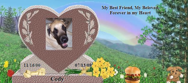 Hello, handsome boy, your mommy's heart and soul, she loves and misses you so much, she hurts so badly. When we love someone so deeply it is so hard to move on, our love is eternal and our bond immortal. You seem such a smart dog, Cody, don't you think it's time you sent some signs to her, so she will know that you are safe and well, maybe my babies could teach you how to catch a rainbow or just a beautiful butterfly. Remind her that maybe she should look upon her loss in another way- that it was in dying that you were born to eternal life. One day when her time comes you will be right there, waiting for her at the end of the tunnel, you will run to her, she will take you in her arms and everything will be well again. Dear Carlie, what a beautiful boy, just remember he is never more than a breath away. xoox