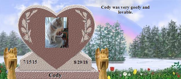 Dear Cody, how purrfectly handsome you are! Please go to the Bridge and purr your precious love down the Rainbow straight into the heart of your mom who misses you so much, and she will send her love right back to you on angels' wings. Dear Brea, your world has lost a very special furpurrson, family member and friend and heaven has welcomed Home a very special soul. Cody is now your very own angel, watching over and for you, just as Tashi, Katy and BG are watching over us, until you meet again and cross the Bridge together. May his sweet presence continually nuzzle your heart until then, and may you find comfort in knowing that the silver thread of love that binds you heart to heart with Cody will never be broken. Many blessings and much peace, Clare and Martha...Please visit our Tashi at http://www.rainbowsbridge.com/residents/TASHI002/resident.HTM