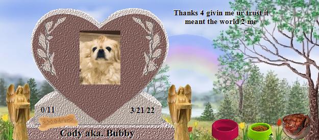 Dear Cody, you are truly handsome. Please go to the Bridge and send your precious love down the Rainbow straight into the heart of your mommy who misses you so much, and she will send her love right back to you on angels' wings. Dear Sally, your world has lost a very special furperson, family member and friend, and heaven has welcomed Home a very special soul. Cody, along with your other precious ones, is now your very own angel, watching over and for you, just as Jackie, Callie, Tashi, Katy and BG are watching over us, until you meet again and cross the Bridge together. May their sweet presence continually nuzzle your heart until then, and may you find comfort in knowing that the silver thread of love that binds you heart to heart with Bubby and the others will never be broken. Many blessings and much peace, Clare and Martha...Please visit our Jackie at https://www.rainbowsbridge.com/residents/JACKI010/resident.HTM