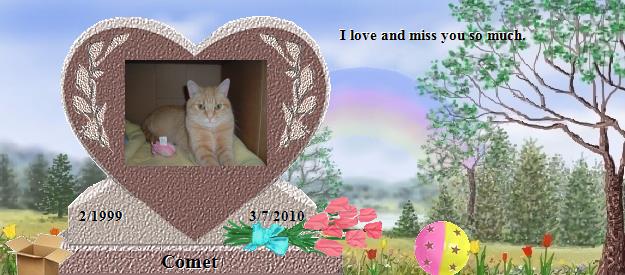 "God gave us our memories so that we might have Roses in December." a quote by J.M. Barrie. May the memories of your blessed furangel Comet, the ones that can't help but bring a smile to your face and a chuckle to your heart as you remember the way your baby's tender love touched your life, be the ones that surround you this Holiday Season. My prayer for each of us this Christmas season, is that each of our babies wrap up a special little sign for each one of us back here, and send it to us. And may you catch a glimpse of your baby's special sign to you, just when your heart needs it most.... May each love-filled memory you have of your beloved furbaby bring to your heart the very warmth and sunshine of the Rainbow itself. That's just one "gift" your fur-angel would want for you this blessed season.... With best wishes for you and your family this Holiday, Karen (Dusty, DJ & Patches' mom) http://RainbowsBridge.com/residents/DUSTY101/Resident.htm