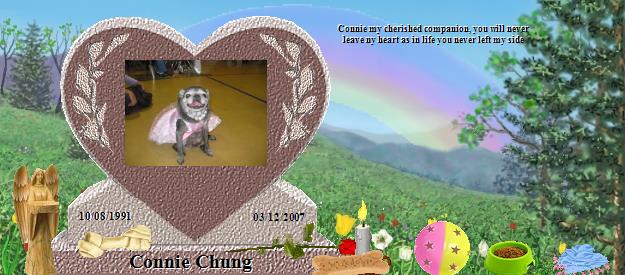 Connie Chung - You were a loyal and loving companion to Kelly because you have been given such a beautiful memorial site to remember you by. Send Kelly some kisses from the Rainbow that you are safe, healthy, happy and will have a lot of fur friends to play with now. Let Kelly know that God has appointed you to be the guardian and protector to watch over until Kelly is called to join you one day at the Bridge. I will tell my Brande to find you and play with you. To Kelly - I send you my sincere sympathy at this time. I too lost my soulmate not long ago, see Brande http://rainbowsbridge.com/residents/BRAND167/Resident.htm - We know that we will see our babies again one day. I leave this quote with you, "heaven is the only place where all the dogs and cats you have ever loved will come running to meet you." Author Unknown