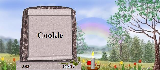 Dear Cookie, you are truly cherished. Please go to the Bridge and send your precious love down the Rainbow straight into the heart of your mum who misses you so much, and she will send her love right back to you on angels' wings. Dear Michaela, your world has lost a very special furperson, family member and friend, and heaven has welcomed Home a very special soul. Cookie is now your very own angel, watching over and for you, just as Tashi, Katy and BG are watching over us, until you meet again and cross the Bridge together. May her sweet presence continually nuzzle your heart until then, and may you find comfort in knowing that the silver thread of love that binds you heart to heart with Cookie will never be broken. Many blessings and much peace, Clare and Martha...Please visit our Tashi at http://www.rainbowsbridge.com/residents/TASHI002/resident.HTM