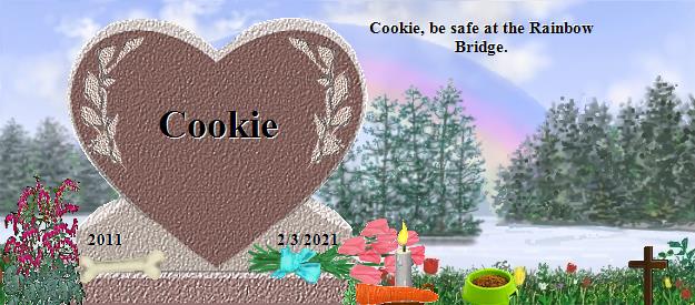 Dear Cookie, you are truly cherished. Please go to the Bridge and send your precious love down the Rainbow straight into the heart of your mom who misses you so much, and she will send her love right back to you on angels' wings. Dear Pam, your world has lost a very special furperson, family member and friend, and heaven has welcomed Home a very special soul. Cookie, along with Cocoa, is now your very own angel, watching over and for you, just as Callie, Tashi, Katy and BG are watching over us, until you meet again and cross the Bridge together. May their sweet presence continually nuzzle your heart until then, and may you find comfort in knowing that the silver thread of love that binds you heart to heart with Cookie and Cocoa will never be broken. Many blessings and much peace, Clare and Martha...Please visit our Callie at http://www.rainbowsbridge.com/residents/CALLI052/resident.HTM