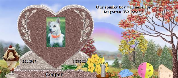 I am so sorry to hear about your loss of Cooper. Please find comfort in knowing that Cooper is now at Rainbows Bridge and making lots of friends. Saying goodbye is never easy. I also lost my precious cat Spooky July 30th 2001 after 16 wonderful years with her. I have lost several babies since Spooky's passing. Hannah 1/11/13, Sammi 8/2/13,Maci 4/9/14, Gabbi 3/20/17, Zoe 1/3/18, Willow 6/4/18, Shelby 6/12/18, Bear 11/17/19 and Bella and Murphy who were both tragically poisoned on 06/18/20. I am sure that Cooper and my babies have all become good friends. You can visit with Spooky at: http://www.rainbowsbridge.com/residents/Spook002/resident.HTM Take Care, Susan