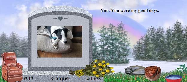 I am so sorry to hear about your loss of Cooper. Please find comfort in knowing that Cooper is now at Rainbows Bridge and making lots of friends. Saying goodbye is never easy. I also lost my precious cat Spooky July 30th, 2001, after 16 wonderful years with her. I have lost several babies since Spooky's passing. Hannah 1/11/13, Sammi 8/2/13, Maci 4/9/14, Gabbi 3/20/17, Zoe 1/3/18, Willow 6/4/18, Shelby 6/12/18, Bear 11/17/19, Bella and Murphy who were both tragically poisoned on 06/18/20, Firefly 12/20/22, and Zachary 02/19/23. I am sure that Cooper and my babies have all become good friends. You can visit with Spooky at: http://www.rainbowsbridge.com/residents/Spook002/resident.HTM Take Care, Susan