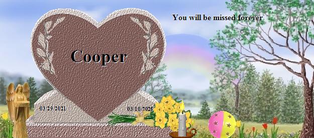 I am so sorry to hear about your loss of Cooper. Please find comfort in knowing that Cooper is now at Rainbows Bridge and making lots of friends. Saying goodbye is never easy. I also lost my precious cat Spooky July 30th, 2001, after 16 wonderful years with her. I have lost several babies since Spooky's passing. Hannah 1/11/13, Sammi 8/2/13, Maci 4/9/14, Gabbi 3/20/17, Zoe 1/3/18, Willow 6/4/18, Shelby 6/12/18, Bear 11/17/19, Bella and Murphy who were both tragically poisoned on 06/18/20, Firefly 12/20/22, Zachary 02/19/23, Tanner 02/22/24 and Tiger 08/01/24. I am sure that Cooper and my babies have all become good friends. You can visit with Spooky at: http://www.rainbowsbridge.com/residents/Spook002/resident.HTM Take Care, Susan