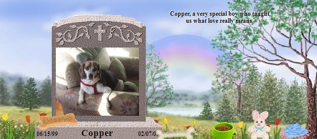 Hi Baby Copper, Happy Easter. You know we miss doing your Easter Biscuit hunt with you. Hope you & Bailey & Maui & Chaco did it this morning. We miss you so much & your special personality you have. Enjoy the warmer weather & don't bicker with your cousins! We love you & miss you & know that God is taking care of you. Mommy & Daddy