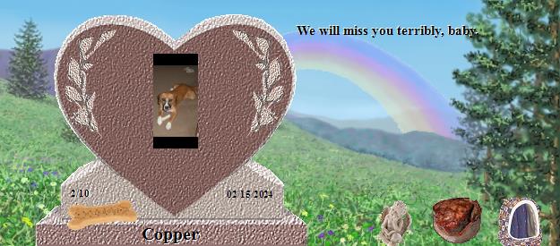 Dear Copper, you are truly beautiful. Please go to the Bridge and send your precious love down the Rainbow straight into the hearts of your mom and dad who miss you so much, and they will send their love right back to you on angels' wings. Dear John and Shelley, your world has lost a very special furperson, family member and friend, and heaven has welcomed Home a very special soul. Copper, along with your other precious ones, is now your very own angel, watching over and for you, just as Jackie, Callie, Tashi, Katy and BG are watching over us, until you meet again and cross the Bridge together. May their sweet presence continually nuzzle your hearts until then, and may you find comfort in knowing that the silver thread of love that binds you heart to heart with Copper and the others will never be broken. Many blessings and much peace, Clare and Martha...Please visit our Jackie at https://www.rainbowsbridge.com/residents/JACKI010/resident.HTM