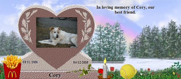 I am so sorry to hear about your loss of Cory. Please find comfort in knowing that Cory is now at Rainbows Bridge and making lots of friends. Saying goodbye is never easy. I also lost my precious cat Spooky July 30th 2001 after 16 wonderful years with her. On January 11, 2013, I lost my faithful friend Hannah who was a beautiful blue tick hound dog. On August 2, 2013 another one of my beautiful cats, Sammi, a black and white tabby, went to Rainbows Bridge. April 9, 2014, Maci, my English Bulldog passed over to Rainbows Bridge. Maci and Hannah were best friends. I am sure that Cory and my babies have all become good friends. You can visit with Spooky at: http://www.rainbowsbridge.com/residents/Spook002/resident.HTM Take Care, Susan