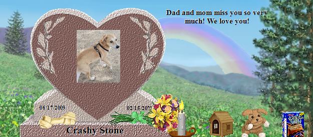 Dear Crashy Stone, you are truly handsome. Please go to the Bridge and send your precious love down the Rainbow straight into the hearts of your mom and dad who miss you so much, and they will send their love right back to you on angels' wings. Dear Jeanette and Steve, your world has lost a very special furperson, family member and friend, and heaven has welcomed Home a very special soul. Crashy is now your very own angel, watching over and for you, just as Jackie, Callie, Tashi, Katy and BG are watching over us, until you meet again and cross the Bridge together. May his sweet presence continually nuzzle your hearts until then, and may you find comfort in knowing that the silver thread of love that binds you heart to heart with Crashy will never be broken. Many blessings and much peace, Clare and Martha...Please visit our Jackie at https://www.rainbowsbridge.com/residents/JACKI010/resident.HTM