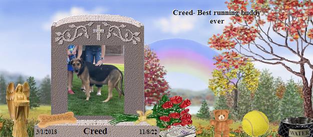 Dear Creed, you are truly handsome. Please go to the Bridge and send your precious love down the Rainbow straight into the hearts of your family who miss you so much, and they will send their love right back to you on angels' wings. Dear Kristi, your world has lost a very special furperson, family member and friend, and heaven has welcomed Home a very special soul. Creed is now your very own angel, watching over and for you, just as Jackie, Callie, Tashi, Katy and BG are watching over us, until you meet again and cross the Bridge together. May his sweet presence continually nuzzle your heart until then, and may you find comfort in knowing that the silver thread of love that binds you heart to heart with Creed will never be broken. Many blessings and much peace, Clare and Martha...Please visit our Jackie at https://www.rainbowsbridge.com/residents/JACKI010/resident.HTM