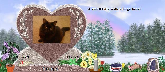 Dear Creepy, how purrfectly handsome you are! Please go to the Bridge and purr your precious love down the Rainbow straight into the heart of your mommy who misses you so much, and she will send her love right back to you on angels' wings. Dear Ashley, your world has lost a very special furpurrson, family member and friend, and heaven has welcomed Home a very special soul. Creepy, along with Gregor, is now your very own angel, watching over and for you, just as Jackie, Callie, Tashi, Katy and BG are watching over us, until you meet again and cross the Bridge together. May their sweet presence continually nuzzle your heart until then, and may you find comfort in knowing that the silver thread of love that binds you heart to heart with Creepy and Gregor will never be broken. Many blessings and much peace, Clare and Martha...Please visit our Jackie at https://www.rainbowsbridge.com/residents/JACKI010/resident.HTM