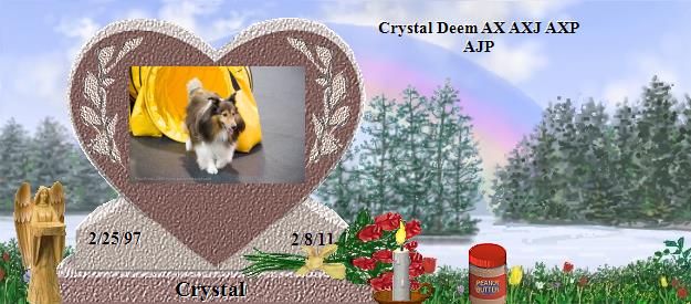 Mark and Sara,I am so sorry for your loss of your beautiful Sheltie Crystal. Both of my children have Shelties, and they mean the world to me. I love my cat "Moe" yesterday (3-29-11) and am still in shock. The only consolation I have is the belief that God does have a place for His creatures, and we will meet again. Again, I am so sorry. Jill