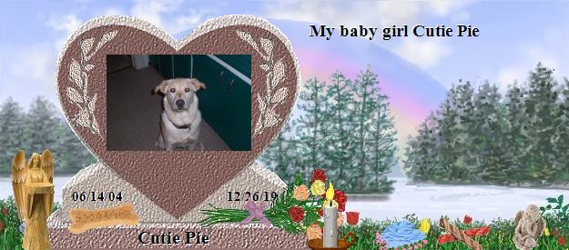 I am so sorry to hear about your loss of Cutie Pie. Please find comfort in knowing that Cutie Pie is now at Rainbows Bridge and making lots of friends. Saying goodbye is never easy. I also lost my precious cat Spooky July 30th 2001 after 16 wonderful years with her. I have lost several babies since Spooky's passing. Hannah 1/11/13, Sammi 8/2/13,Maci 4/9/14, Gabbi 3/20/17, Zoe 1/3/18, Willow 6/4/18, Shelby 6/12/18, and Bear 11/17/19. I am sure that Cutie Pie and my babies have all become good friends. You can visit with Spooky at: http://www.rainbowsbridge.com/residents/Spook002/resident.HTM Take Care, Susan