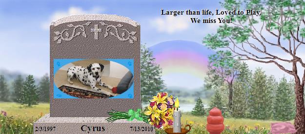 "God gave us our memories so that we might have Roses in December." a quote by J.M. Barrie. May the memories of your blessed furangel Cyrus, the ones that can't help but bring a smile to your face and a chuckle to your heart as you remember the way your baby's tender love touched your life, be the ones that surround you this Holiday Season. My prayer for each of us this Christmas season, is that each of our babies wrap up a special little sign for each one of us back here, and send it to us. And may you catch a glimpse of your baby's special sign to you, just when your heart needs it most.... May each love-filled memory you have of your beloved furbaby bring to your heart the very warmth and sunshine of the Rainbow itself. That's just one "gift" your fur-angel would want for you this blessed season.... With best wishes for you and your family this Holiday, Karen (Dusty, DJ & Patches' mom) http://RainbowsBridge.com/residents/DUSTY101/Resident.htm