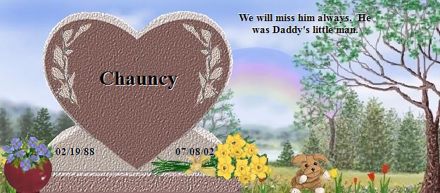 Chauncy - How loyal and loving a companion you were to your family. Send them some kisses from the Rainbow to let them know that you are safe, happy, healthy and have made many fur friends. Let Bruce and Linda know that God has appointed you to be their guardian, protector to watch over them until they are called to the Bridge one day to join you. I will tell my Brande to find you and play with you. To Bruce and Linda - I send my deepest regrets over the loss of Chauncy. I too lost my soulmate not long ago, see Brande