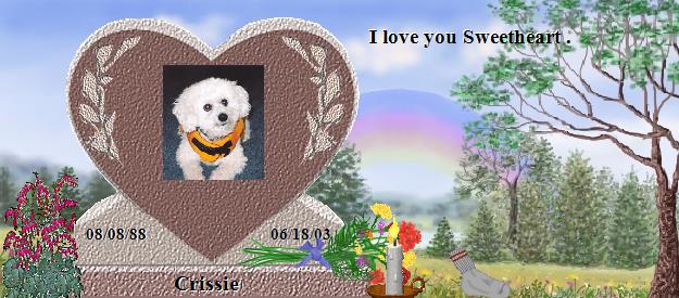 Crissie - How adorable you are and what a sweetheart you have been. Send your mom and dad some kisses from the Rainbow to let them know that you are safe, happy, healthy and have made many fur friends to play with. Let Donald and Karen know that God has appointed you to be the guardian, protector to watch over them until they are called to the Bridge to join you one day. I will tell my Brande to find you and play with you. To Donald and Karen - I send you my deepest regrets over the loss of Crissie. I too lost my soulmate not long ago, see Brande http://rainbowsbridge.com/residents/BRAND167/Resident.htm - We know that God has promised we will be with our babies again one day. I leave this quote with you, "heaven is the only place where all the dogs and cats you have ever loved will come running to meet you." Author Unknown