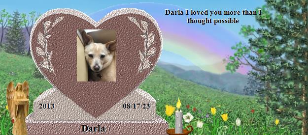 I am so sorry to hear about your loss of Darla. Please find comfort in knowing that Darla is now at Rainbows Bridge and making lots of friends. Saying goodbye is never easy. I also lost my precious cat Spooky July 30th, 2001, after 16 wonderful years with her. I have lost several babies since Spooky's passing. Hannah 1/11/13, Sammi 8/2/13, Maci 4/9/14, Gabbi 3/20/17, Zoe 1/3/18, Willow 6/4/18, Shelby 6/12/18, Bear 11/17/19, Bella and Murphy who were both tragically poisoned on 06/18/20, Firefly 12/20/22, and Zachary 02/19/23. I am sure that Darla and my babies have all become good friends. You can visit with Spooky at: http://www.rainbowsbridge.com/residents/Spook002/resident.HTM Take Care, Susan