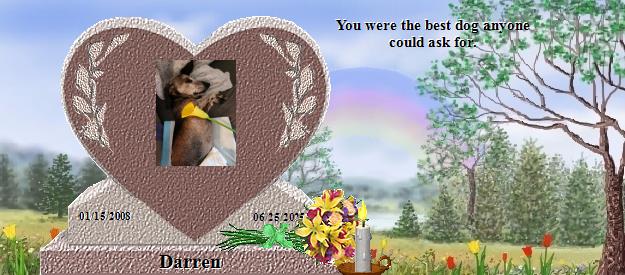 Dear Darren, you are truly handsome. Please go to the Bridge and send your precious love down the Rainbow straight into the hearts of your family who misses you so much, and they will send their love right back to you on angels' wings. Dear Steve and Randy, your world has lost a very special furperson, family member and friend, and heaven has welcomed Home a very special soul. Darren is now your very own angel, watching over and for you, just as Fritz, Jackie, Callie, Tashi, Katy and BG are watching over me, until you meet again and cross the Bridge together. May his sweet presence continually nuzzle your hearts until then, and may you find comfort in knowing that the silver thread of love that binds you heart to heart with Darren will never be broken. Many blessings and much peace, Clare...Please visit my Fritz at https://www.rainbowsbridge.com/residents/FRITZ021/resident.htm