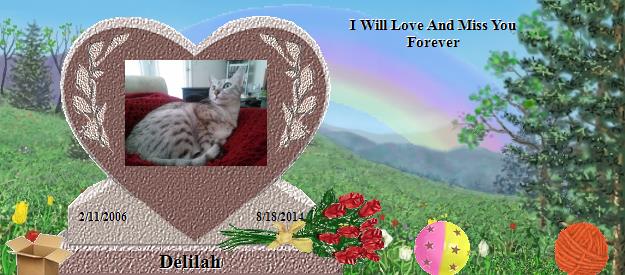 Dear Delilah, you are purrfectly beautiful. Please go to the Bridge and purr your precious love down the Rainbow straight into the heart of your daddy who misses you so much, and he will send his love right back to you on angels' wings. Dear Cliff, your world has lost a very special furpurrson, family member and friend, and heaven has welcomed Home a very special soul. Dilly is now your very own angel, watching over and for you, just as Tashi, Katy and BG are watching over us, until you meet again and cross the Bridge together. May her sweet love continually nuzzle your heart until then, and may you find comfort in knowing that the silver thread of love that binds you heart to heart with Delilah will never be broken. Many blessings and much peace, Clare and Martha...Please visit our Tashi at http://www.rainbowsbridge.com/residents/TASHI002/resident.HTM