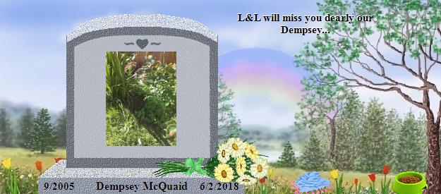 Dear Dempsey McQuaid, you are truly handsome. Please go to the Bridge and send your precious love down the Rainbow straight into the hearts of your family who miss you so much, and they will send their love right back to you on angels' wings. Dear Luz and Larry, your world has lost a very special furperson, family member and friend, and heaven has welcomed Home a very special soul. Dempsey is now your very own angel, watching over and for you, just as Tashi, Katy and BG are watching over us, until you meet again and cross the Bridge together. May his sweet presence continually nuzzle your hearts until then, and may you find comfort in knowing that the silver thread of love that binds you heart to heart with Dempsey will never be broken. Many blessings and much peace, Clare and Martha...Please visit our Tashi at http://www.rainbowsbridge.com/residents/TASHI002/resident.HTM