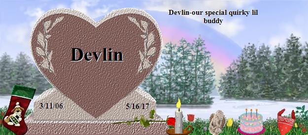 Dear Devlin, you are truly cherished. Please go to the Bridge and send your precious love down the Rainbow straight into the hearts of your mommy and daddy who miss you so much, and they will send their love right back to you on angels' wings. Dear Karen and Mike, your world has lost a very special furperson, family member and friend, and heaven has welcomed Home a very special soul. Devlin, along with Wicket, is now your very own angel, watching over and for you, just as Tashi, Katy and BG are watching over us, until you meet again and cross the Bridge together. May their sweet love continually nuzzle your hearts until then, and may you find comfort in knowing that the silver thread of love that binds you heart to heart with Devlin and Wicket will never be broken. Many blessings and much peace, Clare and Martha...Please visit our Tashi at http://www.rainbowsbridge.com/residents/TASHI002/resident.HTM
