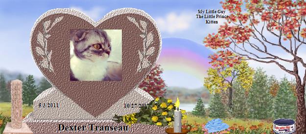 Dear Dexter Transeau, how purrfectly handsome you are. Please go to the Bridge and purr your precious love down the Rainbow straight into the heart of your mommy who misses you so much, and she will send her love right back to you on angels' wings. Dear Lacy, your world has lost a very special furpurrson, family member and friend, and heaven has welcomed Home a very special soul. Dexter is now your very own angel, watching over and for you, just as Tashi, Katy and BG are watching over us, until you meet again and cross the Bridge together. May his sweet love continually nuzzle your heart until then, and may you find comfort in knowing that the silver thread of love that binds you heart to heart with Dexter will never be broken. Many blessings and much peace, Clare and Martha...Please visit our Tashi at http://www.rainbowsbridge.com/residents/TASHI002/resident.HTM