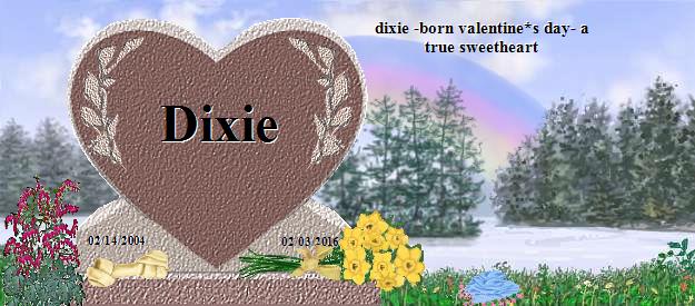 Dear Dixie, you are truly cherished. Please go to the Bridge and send your precious love down the Rainbow straight into the hearts of your family who miss you so much, and they will send their love right back to you on angels' wings. Dear Joe, Donna and Joey, your world has lost a very special furperson, family member and friend, and heaven has welcomed Home a very special soul. Dixie is now your very own angel, watching over and for you, just as Tashi, Katy and BG are watching over us, until you meet again and cross the Bridge together. May her sweet love continually nuzzle your hearts until then, and may you find comfort in knowing that the silver thread of love that binds you heart to heart with Dixie will never be broken. Many blessings and much peace, Clare and Martha...Please visit our Tashi at http://www.rainbowsbridge.com/residents/TASHI002/resident.HTM