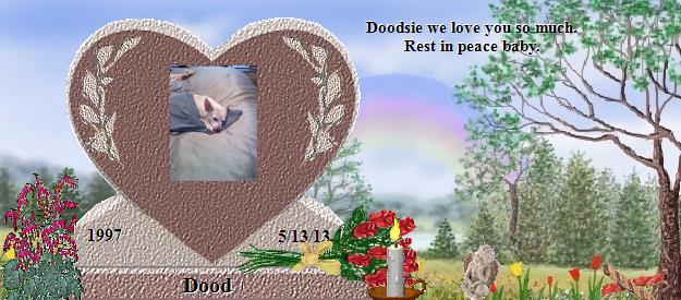 Dear Lana & Chuck, I am deeply sorry for your loss, my thoughts and prayers are with you. It is never easy losing our beloved pets, they leave such deep paw prints on our hearts. But this isn't good bye, rather I'll see you again. Dood was certanily a gift from God, he found a way to get him to you. What a lucky litte guy he was to find such a great loving home. When your time comes to make that journey, he'll be there waiting for you. Dood will always be with you, in your hearts and his memories will forever be shining so brightly. Hugs. If you'd care, please visit my Sassy & Frosty. http://rainbowsbridge.com/residents/FROST011/Resident.htm http://RainbowsBridge.com/residents/SASSY149/Resident.htm