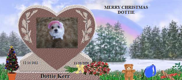 Dear Dottie Kerr, you are truly beautiful. Please go to the Bridge and send your precious love down the Rainbow straight into the hearts of your mommy and daddy who miss you so much, and they will send their love right back to you on angels' wings. Dear Gomer and Carolyn, your world has lost a very special furperson, family member and friend, and heaven has welcomed Home a very special soul. Dottie is now your very own angel, watching over and for you, just as Callie, Tashi, Katy and BG are watching over us, until you meet again and cross the Bridge together. May her sweet presence continually nuzzle your hearts until then, and may you find comfort in knowing that the silver thread of love that binds you heart to heart with Dottie will never be broken. Many blessings and much peace, Clare and Martha...Please visit our Callie at http://www.rainbowsbridge.com/residents/CALLI052/resident.HTM