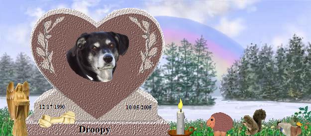 Hello Droopy looks like you went to the bridge about 2 and 1/2 months before my Princess did...I am sure you two are having a grand time in your new home. I wish your mommy lots of beautiful memories of you to help her thru the sadness of your loss.