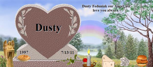I am so sorry to hear about your loss of Dusty. Please find comfort in knowing that Dusty is now at Rainbows Bridge and making lots of friends. Saying goodbye is never easy. I also lost my precious cat Spooky July 30th 2001 after 16 wonderful years with her. I am sure that Dusty and Spooky have become good friends. You can visit with Spooky at: http://www.rainbowsbridge.com/residents/Spook002/resident.HTM Take Care, Susan