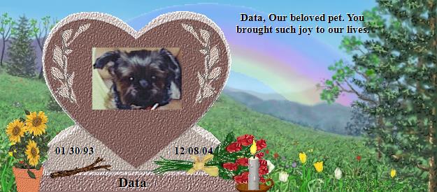 Data - You are a precious little one and you are now God's Special Angel. Send your mom and dad some signs and kisses from the Rainbow to let them know that you are safe, happy, healthy and have made many friends. Let Danny and Yong know that God has appointed you to be the guardian, protector to watch over them until they are called to join you at the Bridge someday. I will tell my Brande to find you and play with you. To Danny and Yong - I send my deepest regrets over the loss of Data. I too lost my soulmate not long ago, see Brande