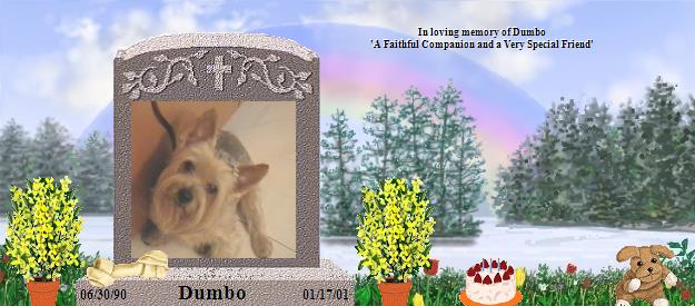Dumbo - you were your own man and you did it your way! Your family loves you deeply! Send them some kisses from the Rainbow to let them know that you are safe, happy, healthy and have made many fur friends to play with. Let Michelle and Steph know that God has appointed you to be their guardian, protector to watch over them until they come to the Bridge one day to join you. I will tell my Brande to find you and play with you. To Michelle and Steph - I send my deepest regrets to you over the loss of Dumbo. I too lost my soulmate not long ago, see Brande http://rainbowsbridge.com/residents/BRAND167/Resident.htm - We know that God has promised we will be with our babies again one day. I leave this quote with you, "heaven is the only place where all the dogs and cats you have ever loved will come running to meet you." Author Unknown