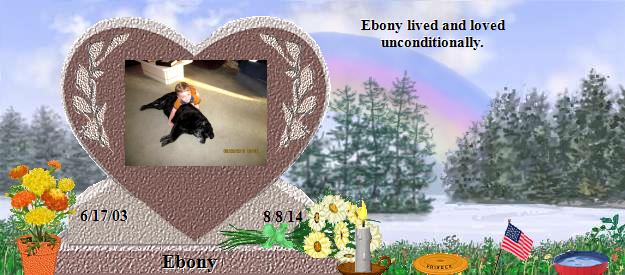 Oh, sweet and precious Ebony, I have read & heard so many wonderful things about you in the last two years. It is truly an honor & privilege for me to meet an amazing spirit like you. As you know though, Ebony, having had to say 'so long for now' to your brother & sisters, & having shared home, life & love with your loving Dad & Mom, bidding farewell to a being & soul like you is the hardest thing a human ever has to do. Such is the magical & deep power of the unconditional love, devotion & courage you share with your family forever. I know for certain, sweet Ebony, that my little Doxie angel Cinnie will comfort you, & love you as she does precious Abby, Kyra & Tucker, for she is generous, & her heart is filled with abundant love. And I ask you all, in turn, to keep watch over you Mom & Dad, & your beloved Molly & Dixie, as the remember, & honor, & love you, and miss you, so very much.