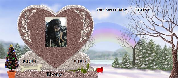 Dear Ebony, you are truly gorgeous. Please go to the Bridge and send your precious love down the Rainbow straight into the hearts of your mom and dad who miss you so much, and they will send their love right back to you on angels' wings. Dear Frank and Lorraine, your world has lost a very special furperson, family member and friend, and heaven has welcomed Home a very special soul. Ebony, along with Brandy, is now your very own angel, watching over and for you, just as Tashi, Katy and BG are watching over us, until you meet again and cross the Bridge together. May their sweet love continually nuzzle your hearts until then, and may you find comfort in knowing that the silver thread of love that binds you heart to heart with Ebony and Brandy will never be broken. Many blessings and much peace, Clare and Martha...Please visit our Tashi at http://www.rainbowsbridge.com/residents/TASHI002/resident.HTM